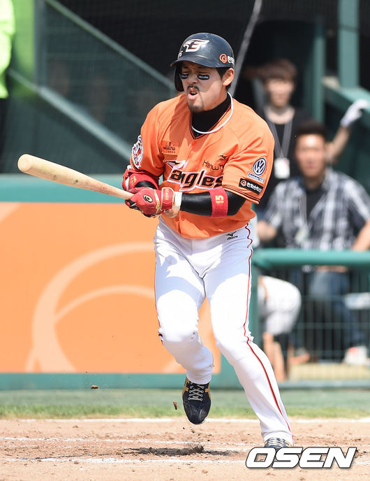 2회말 2사 한화 이용규가 파울타구에 맞아 고통스러워고 있다.