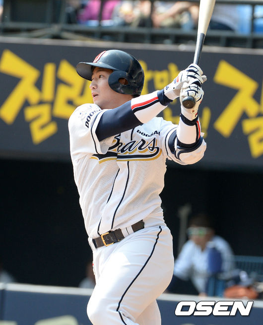 26일 오후 서울 잠실야구장에서 열린 '2015 타이어뱅크 KBO리그' 두산 베어스와 KIA 타이거즈의 경기, 2회말 1사 1,2루에서 두산 최재훈이 선취 적시타를 날리며 타구를 바라보고 있다.