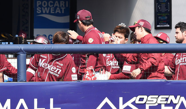 4회초 1사 1,2루에서 넥센 김하성의 2타점 적시타때 홈을 밟은 박병호와 윤석민이 더그아웃에서 동료들과 하이파이브를 하고 있다.