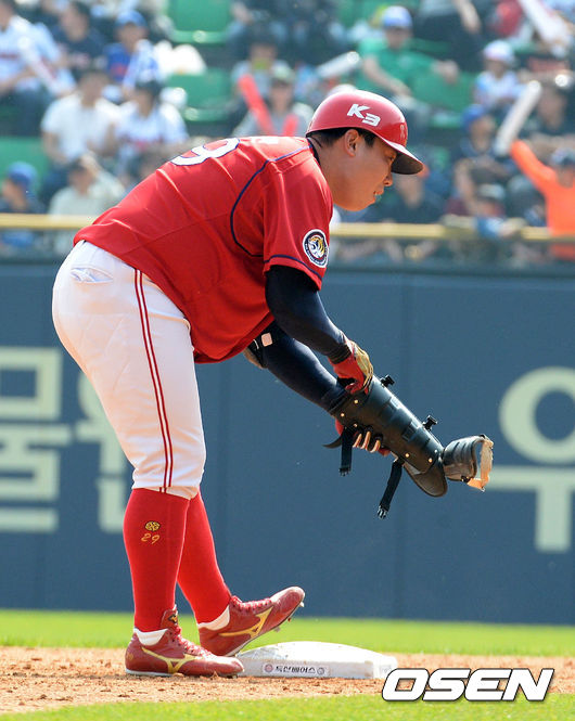 26일 오후 서울 잠실야구장에서 열린 '2015 타이어뱅크 KBO리그' 두산 베어스와 KIA 타이거즈의 경기, 4회초 무사 1루에서 KIA 나지완이 동점 적시 2루타를 날리고 타임을 외치고 있다.