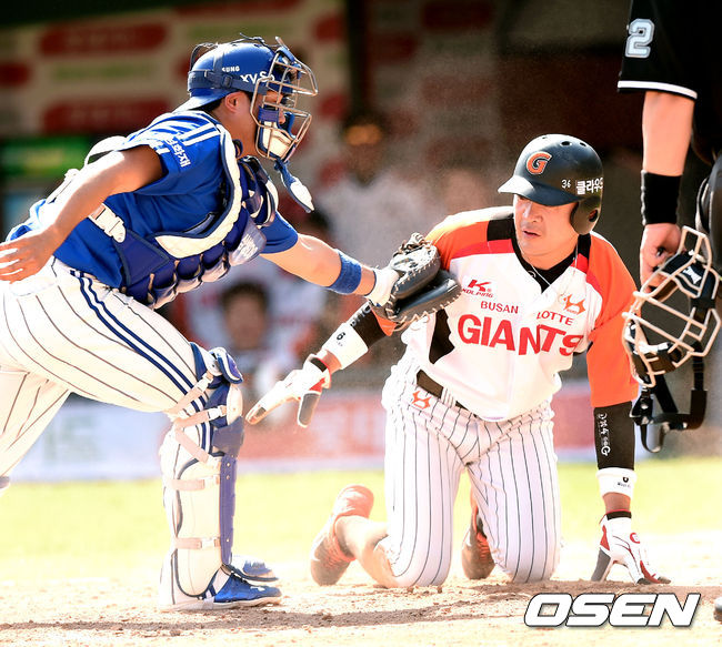 26일 오후 부산 사직구장에서 열린 '2015 타이어뱅크 KBO리그' 롯데 자이언츠와 삼성 라이온즈의 경기, 4회말 1사 2,3루 롯데 손아섭의 내야땅볼때 3루 주자 문규현이 삼성 이지영 포수에게 태그아웃되고 있다.