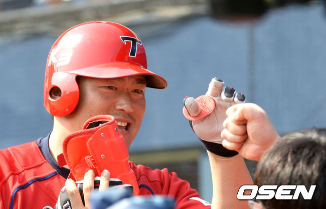26일 오후 서울 잠실야구장에서 열린 '2015 타이어뱅크 KBO리그' 두산 베어스와 KIA 타이거즈의 경기, 4회초 1사 만루에서 대타로 나선 KIA 최희섭이 내야 안타로 역전에 성공하며 교체, 더그아웃에서 동료선수들과 기뻐하고 있다.