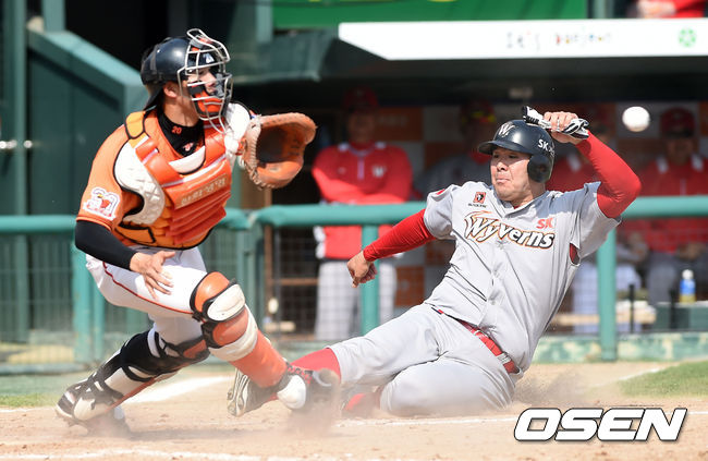 5회초 2사 2루 SK 이재원이 브라운의 적시타로 득점을 올리고 있다.