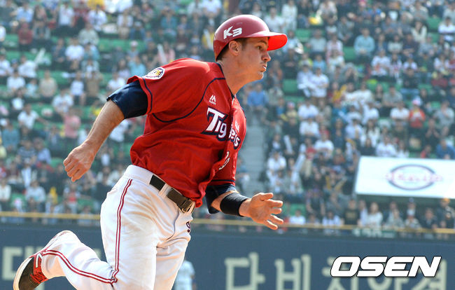 26일 오후 서울 잠실야구장에서 열린 '2015 타이어뱅크 KBO리그' 두산 베어스와 KIA 타이거즈의 경기, 4회초 무사 1루에서 KIA 나지완의 동점 적시 2루타에 필이 홈으로 전력질주하고 있다.