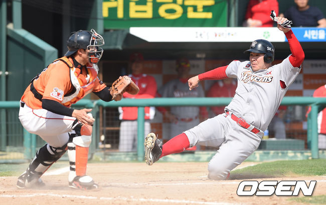 5회초 2사 2루 SK 이재원이 브라운의 적시타로 득점을 올리고 있다.
