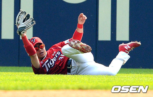 26일 오후 서울 잠실야구장에서 열린 '2015 타이어뱅크 KBO리그' 두산 베어스와 KIA 타이거즈의 경기, 4회말 무사에서 KIA 이호신이 두산 오재원의 중견수 플라이 타구를 몸 날려 잡아내고 있다.