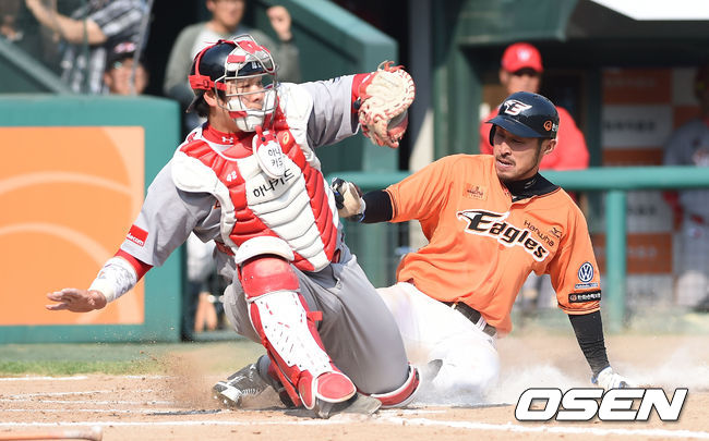 6회말 무사 1루 한화 김경언이 김태균의 적시타로 득점을 올리고 있다.