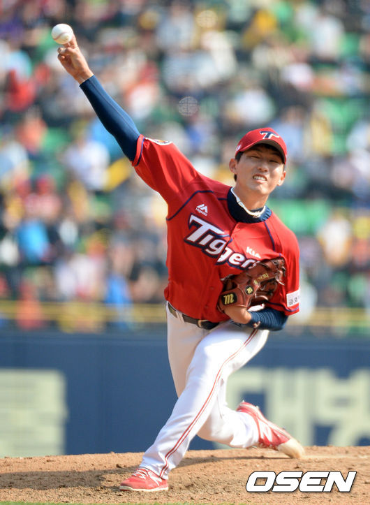 26일 오후 서울 잠실야구장에서 열린 '2015 타이어뱅크 KBO리그' 두산 베어스와 KIA 타이거즈의 경기, 5회말 KIA 홍건희가 역투하고 있다.