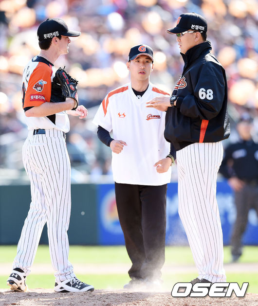 26일 오후 부산 사직구장에서 열린 '2015 타이어뱅크 KBO리그' 롯데 자이언츠와 삼성 라이온즈의 경기, 8회초 2사 2,3루 삼성 우동균 타석때 롯데 염종석 투수코치가 마운드 올라 레일리 선발투수와 이야기를 나누고 있다.