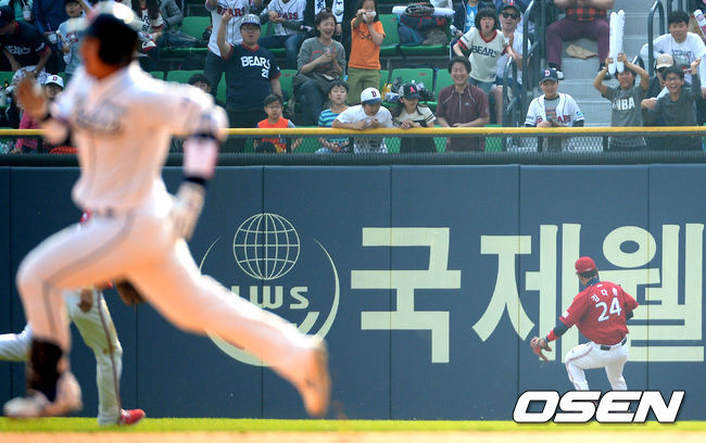 26일 오후 서울 잠실야구장에서 열린 '2015 타이어뱅크 KBO리그' 두산 베어스와 KIA 타이거즈의 경기, 7회말 무사에서 KIA 김다원이 두산 최재훈의 우전 안타 타구를 뒤로 빠뜨리며 3루타를 허용하고 있다.