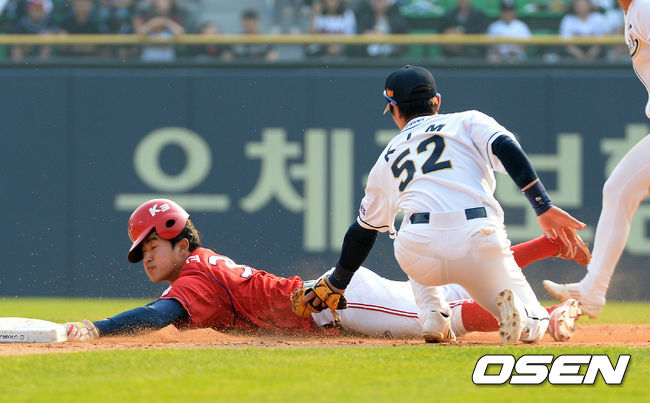 26일 오후 서울 잠실야구장에서 열린 '2015 타이어뱅크 KBO리그' 두산 베어스와 KIA 타이거즈의 경기, 9회초 1사 1루에서 KIA 고영우가 두산 김재호의 태그를 피해 2루 도루에 성공하며 있다. 2루심이 아웃판정을 내렸지만 합의 판정끝에 세이프.