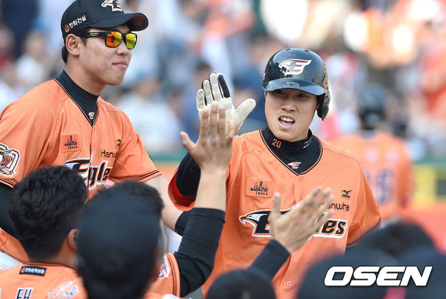 8회말 1사 1루 한화 정범모가 권용관의 안타와 우익수 브라운의 송구 실책으로 득점을 올리고 있다.