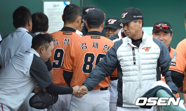 승리를 거둔 김성근 감독이 코치들과 악수를 나누고 있다. / youngrae@osen.co.kr