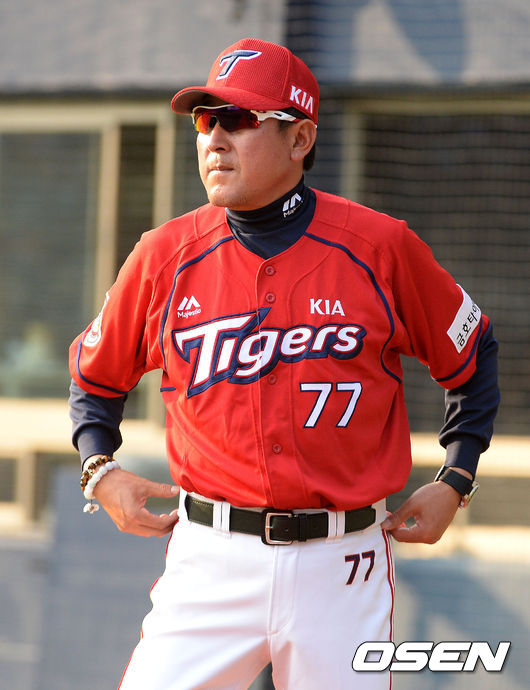 26일 오후 서울 잠실야구장에서 열린 '2015 타이어뱅크 KBO리그' 두산 베어스와 KIA 타이거즈의 경기, 9회말 KIA 김기태 감독이 그라운드로 나와 수비 위치 사인을 내고 있다.