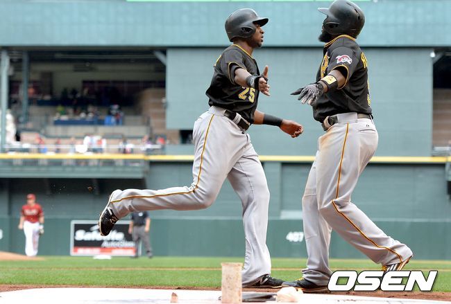 1회초 피츠버그 공격 2사 만루 상황 페드로 알바레스의 선제 2타점 적시 우전안타 때 홈을 밟은 조쉬 해리슨과 그레고리 폴랑코가 인사를 나누고 있다.