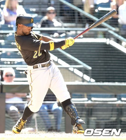 5회초 피츠버그 공격 1사 1루 상황 앤드류 매커친이 중전안타를 날리고 있다 .