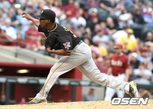 8회말 애리조나 공격 때 마운드에 오른 피츠버그 투수 아키메네스 카미네로가 힘차게 공을 뿌리고 있다 .