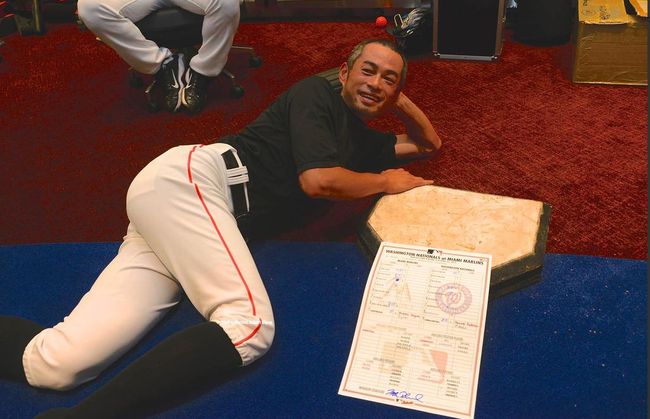 구단이 글과 함께 공개한 사진에서 이치로는 26일 경기 때 그가 밟은 홈플레이트 옆에 누워 환히 웃고 있다. 홈플레이트 위에는 그날 양팀의 선발 라인업이 기념으로 놓여져 있는 모습.