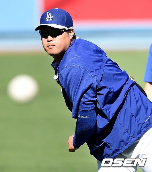 28일(이하 한국시간) 미국 캘리포니아주 로스앤젤레스 다저스타디움에서 열리는 '2015 메이저리그' LA 다저스와 샌프란시스코 자이언츠의 경기를 앞두고, 다저스 투수 류현진이 캐치볼을 하고 있다.