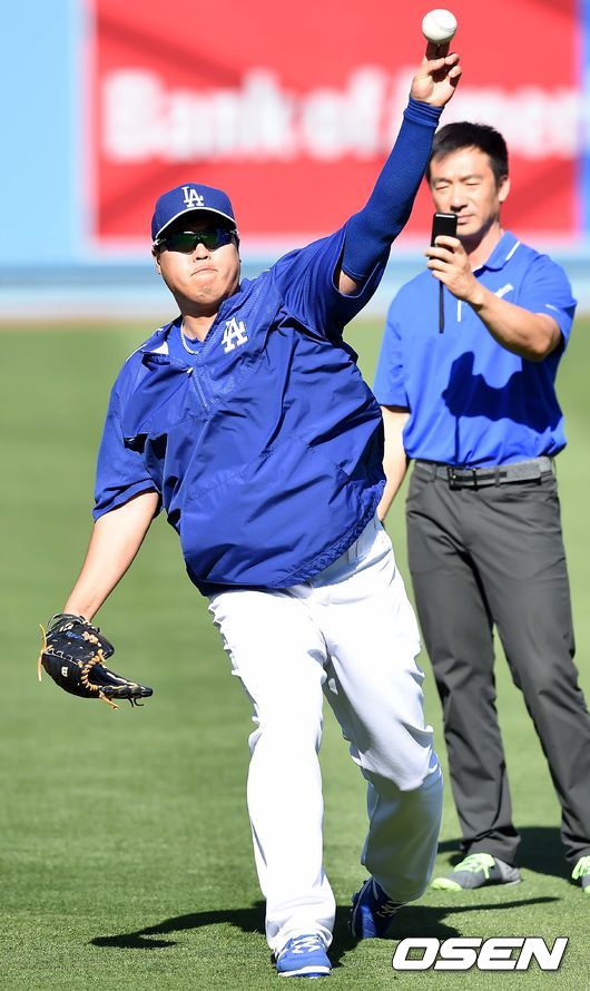 28일(이하 한국시간) 미국 캘리포니아주 로스앤젤레스 다저스타디움에서 열리는 '2015 메이저리그' LA 다저스와 샌프란시스코 자이언츠의 경기를 앞두고, 다저스 투수 류현진이 캐치볼을 하고 있다.