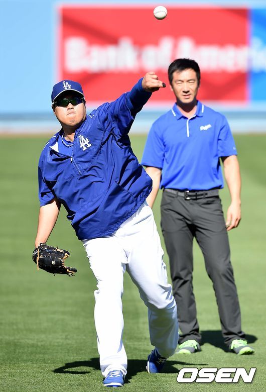 28일(이하 한국시간) 미국 캘리포니아주 로스앤젤레스 다저스타디움에서 열리는 '2015 메이저리그' LA 다저스와 샌프란시스코 자이언츠의 경기를 앞두고, 다저스 투수 류현진이 캐치볼을 하고 있다.