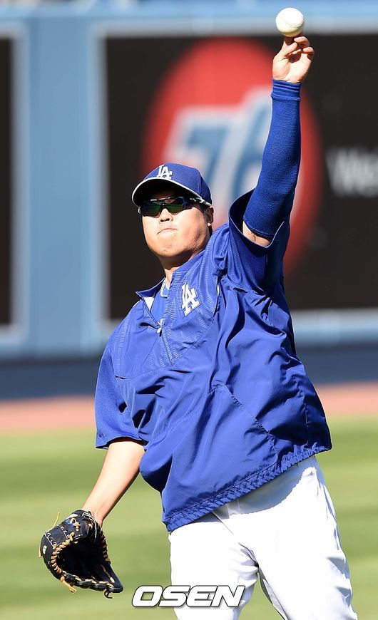 28일(이하 한국시간) 미국 캘리포니아주 로스앤젤레스 다저스타디움에서 열리는 '2015 메이저리그' LA 다저스와 샌프란시스코 자이언츠의 경기를 앞두고, 다저스 투수 류현진이 캐치볼을 하고 있다.