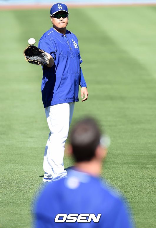 28일(이하 한국시간) 미국 캘리포니아주 로스앤젤레스 다저스타디움에서 열리는 '2015 메이저리그' LA 다저스와 샌프란시스코 자이언츠의 경기를 앞두고, 다저스 투수 류현진이 캐치볼을 하고 있다.