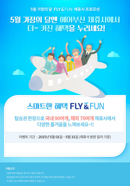한편 에어부산 탑승권 우대 할인 서비스 ‘FLY&FUN’은 제휴사에서 탑승권을 제시할 경우 이용할 수 있고 탑승일로부터 31일 이내 사용 가능하다.