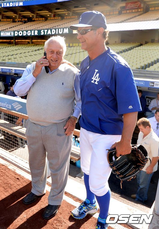 28일(이하 한국시간) 미국 캘리포니아주 로스앤젤레스 다저스타디움에서 열리는 '2015 메이저리그' LA 다저스와 샌프란시스코 자이언츠의 경기를 앞두고, 토미 라소다 다저스 고문과 돈 매팅리 다저스 감독이 인사를 나누고 있다.