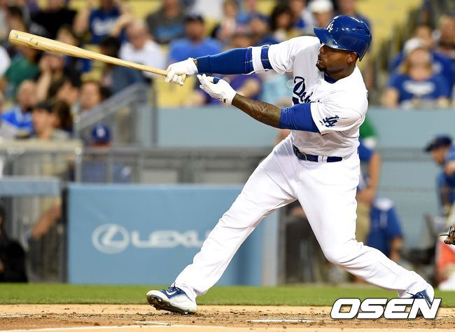 2회말 다저스 공격 선두타자로 나선 칼 크로포드가 우익선상 3루타를 날리고 있다.