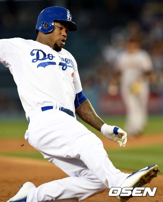 2회말 다저스 공격 선두타자로 나선 칼 크로포드가 우익선상 3루타를 날리고 3루로 슬라이딩 하고 있다.