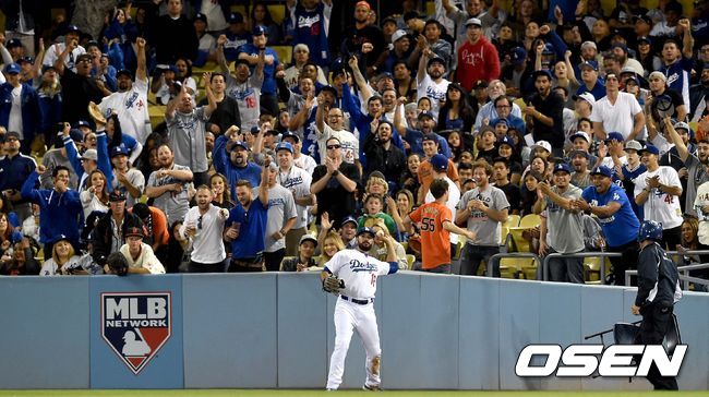 6회초 샌프란시스코 공격 1사 주자없는 상황 맥기히의 타구를 다저스 우익수 이디어가 멋지게 잡아내 팬들의 박수를 받고 있다.