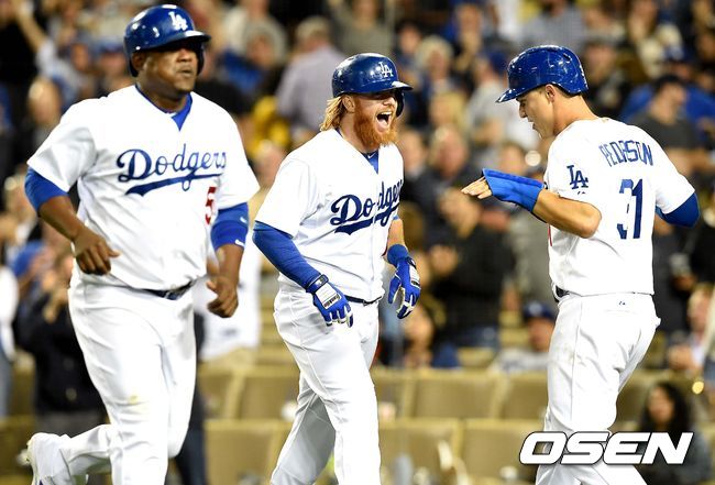 8회말 다저스 공격 1사 1, 2루 상황 대타 저스틴 터너가 중월 스리런포를 날리고 홈을 밟은 뒤 작 피더슨과 인사를 나누며 기뻐하고 있다.