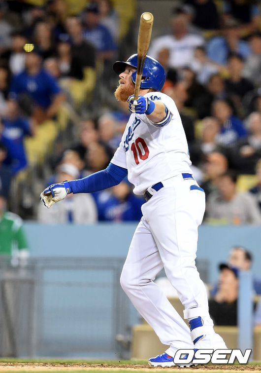 8회말 다저스 공격 1사 1, 2루 상황 대타 저스틴 터너가 중월 스리런포를 날리고 있다.