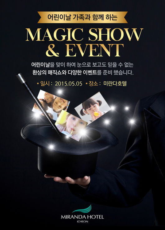 특히 '해피 매직 쇼 패키지 (HAPPY MAGIC SHOW PKG)'를 구매하는 이용자들에게는 가족이 함께 미란다 호텔에서 열리는 매직쇼를 관람할 수 있는 관람권을 증정한다. 미란다 호텔의 환상적인 매직쇼는 어린이날 당일 오후 2시부터 열릴 예정이며, 매직쇼 관람이 끝난 후에는 미란다 호텔의 숙박권 및 다양한 이용권을 증정하는 경품 추첨 행사도 진행 될 예정이다.