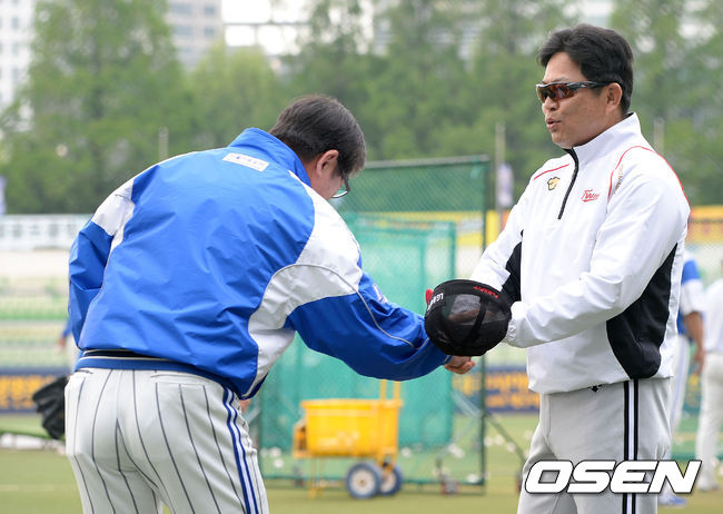 28일 오후 대구 시민운동장야구장에서 열릴 '2015 타이어뱅크 KBO 리그' 삼성과 LG의 경기에 앞서 LG 양상문 감독과 삼성 류중일 감독과 인사를 나누고 있다.