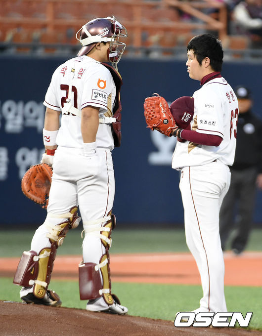 28일 오후 서울 목동야구장에서 열린 '2015 타이어뱅크 KBO 리그' 넥센 히어로즈와 롯데 자이언츠의 경기, 2회초 1사 이후 넥센 한현희가 롯데 강민호 볼넷, 김대우 몸에 맞는 공으로 출루시키자 박동원 포수가 마운드를 방문하고 있다.