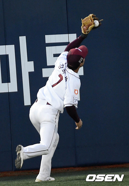 28일 오후 서울 목동야구장에서 열린 '2015 타이어뱅크 KBO 리그' 넥센 히어로즈와 롯데 자이언츠의 경기, 1회초 1사 주자 만루 넥센 김하성이 롯데 김문호의 파울타구를 처리하고 있다. 3루주자 롯데 강민호가 홈을 밟아 롯데가 1점을 득점했다.