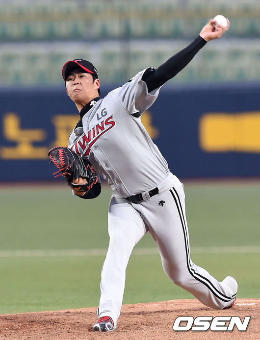 1회말 무사에서 LG 선발투수 임지섭이 힘차게 공을 던지고 있다.
