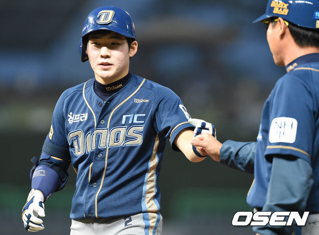 28일 오후 인천SK행복드림구장에서 열린 '2015 타이어뱅크 KBO 리그' SK 와이번스와 NC 다이노스의 경기 2회초 2사 2,3루 박민우가 2타점 적시타를 치고 전준호 코치와 하이파이브를 하고 있다.