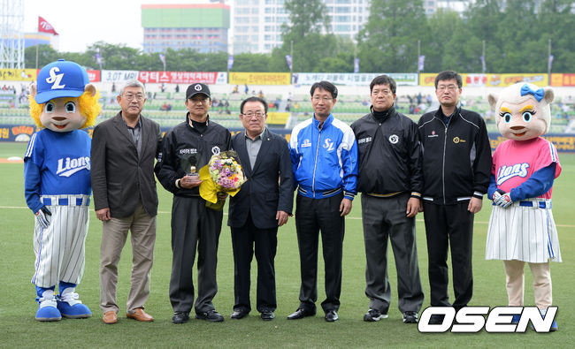 경기에 앞서 개인통산 1000경기 출장을 기록한 박종천 KBO 심판위원이 기념상 수상 후 포토타임을 갖고 있다.