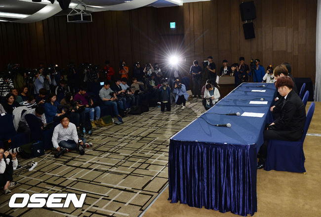 28일 오후 서울 마포구 상암 스탠포드 호텔 그랜드 볼룸에서 열린 옹달샘(유세윤, 장동민, 유상무) 긴급 기자회견, 장동민 유상무 유세윤이 고개를 숙이고 있다.
