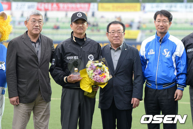경기에 앞서 개인통산 1000경기 출장을 기록한 박종천 KBO 심판위원이 기념상 수상 후 포토타임을 갖고 있다.