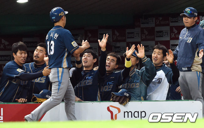 28일 오후 인천SK행복드림구장에서 열린 '2015 타이어뱅크 KBO 리그' SK 와이번스와 NC 다이노스의 경기 2회초 2사 2,3루 박민우의 2타점 적시타에 득점한 3루주자 손시헌이 덕아웃에서 동료들과 하이파이브를 하고 있다.
