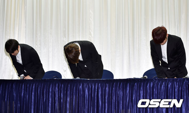 28일 오후 서울 마포구 상암 스탠포드 호텔 그랜드 볼룸에서 열린 옹달샘(유세윤, 장동민, 유상무) 긴급 기자회견, 장동민 유상무 유세윤이 기자회견 중 고개 숙여 사죄하고 있다.