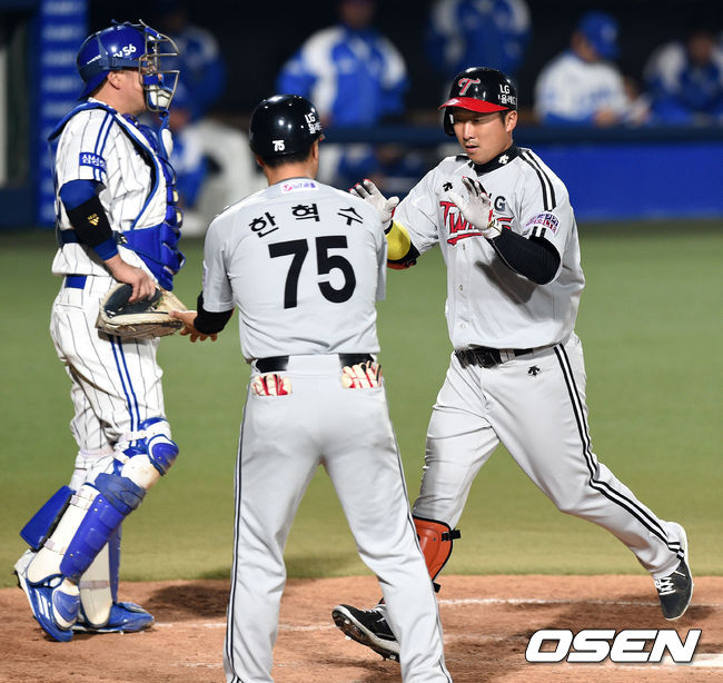 4회초 무사 1루에서 LG 이병규가 좌중월 투런 홈런을 치고 홈에서 한혁수 코치와 하이파이브를 하고 있다.