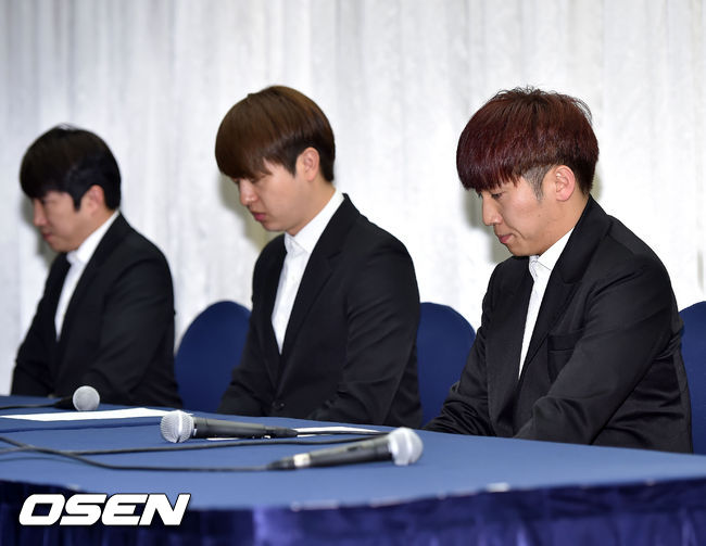 28일 오후 서울 마포구 상암 스탠포드 호텔 그랜드 볼룸에서 열린 옹달샘(유세윤, 장동민, 유상무) 긴급 기자회견, 장동민 유상무 유세윤이 기자회견을 하고 있다.