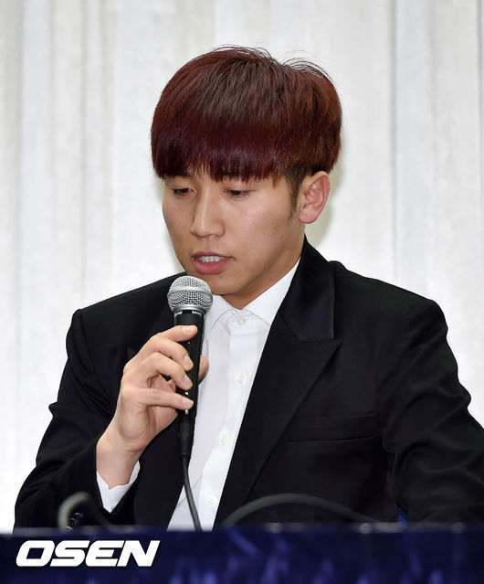 28일 오후 서울 마포구 상암 스탠포드 호텔 그랜드 볼룸에서 열린 옹달샘(유세윤, 장동민, 유상무) 긴급 기자회견, 유세윤이 질문에 답하고 있다.