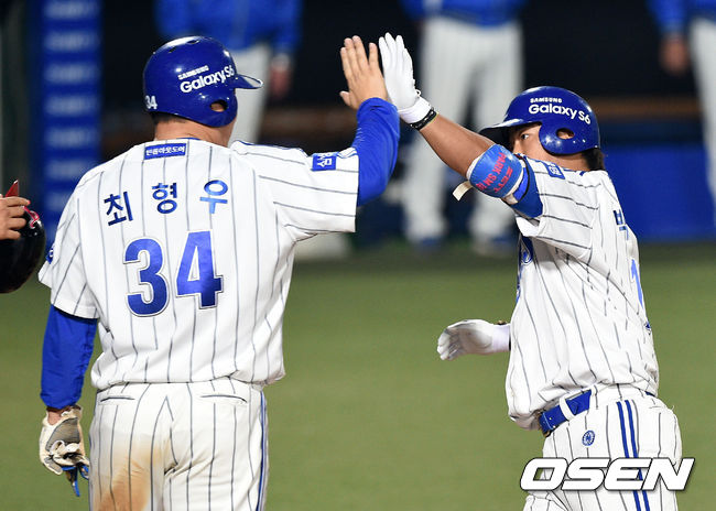 4회말 1사 1루에서 삼성 박석민이 좌중월 투런 홈런을 치고 홈에서 최형우와 하이파이브를 하고 있다.