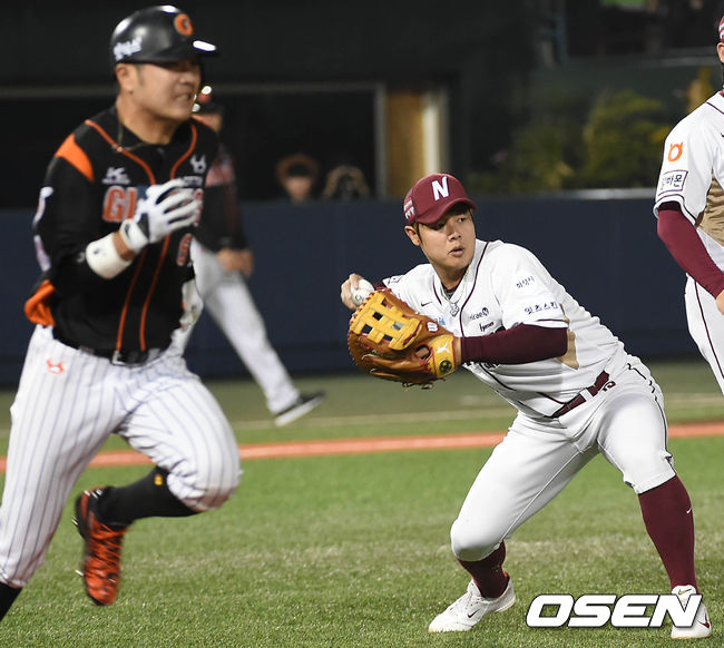 28일 오후 서울 목동야구장에서 열린 '2015 타이어뱅크 KBO 리그' 넥센 히어로즈와 롯데 자이언츠의 경기, 4회초 1사 주자 1,3루 롯데 문규현의 스퀴즈번트를 넥센 윤석민이 처리하고 있다.